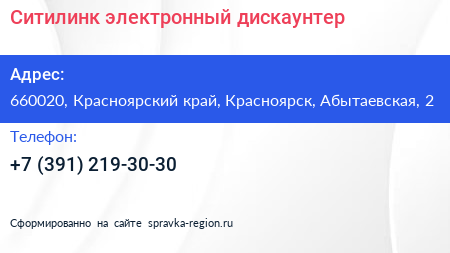 Ситилинк, электронный дискаунтер по адресу 660020, Красноярский край, Красноярск, Абытаевская, 2 в дальнейшем Организация, размещена в следующих категориях: