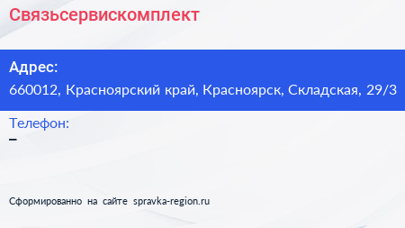 Связьсервискомплект по адресу 660012, Красноярский край, Красноярск, Складская, 29/3 в дальнейшем Организация, размещена в следующих категориях: