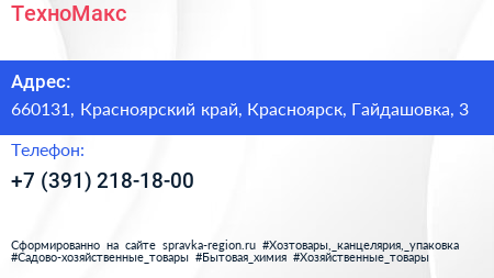 ТехноМакс по адресу 660131, Красноярский край, Красноярск, Гайдашовка, 3 в дальнейшем Организация, размещена в следующих категориях: