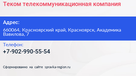 Теком, телекоммуникационная компания по адресу 660064, Красноярский край, Красноярск, Академика Вавилова, 7 в дальнейшем Организация, размещена в следующих категориях: