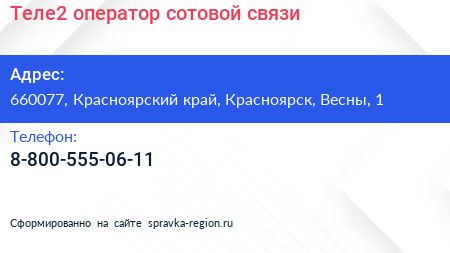 Теле2, оператор сотовой связи по адресу 660077, Красноярский край, Красноярск, Весны, 1 в дальнейшем Организация, размещена в следующих категориях: