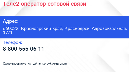 Теле2, оператор сотовой связи по адресу 660022, Красноярский край, Красноярск, Аэровокзальная, 17/1 в дальнейшем Организация, размещена в следующих категориях:
