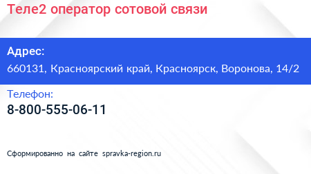 Теле2, оператор сотовой связи по адресу 660131, Красноярский край, Красноярск, Воронова, 14/2 в дальнейшем Организация, размещена в следующих категориях: