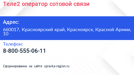 Теле2, оператор сотовой связи по адресу 660017, Красноярский край, Красноярск, Красной Армии, 10 в дальнейшем Организация, размещена в следующих категориях: