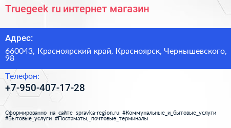 Truegeek.ru, интернет-магазин по адресу 660043, Красноярский край, Красноярск, Чернышевского, 98 в дальнейшем Организация, размещена в следующих категориях:
