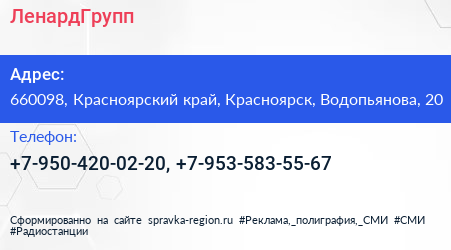 ЛенардГрупп по адресу 660098, Красноярский край, Красноярск, Водопьянова, 20 в дальнейшем Организация, размещена в следующих категориях:
