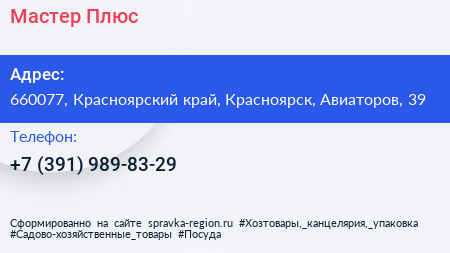 Мастер Плюс по адресу 660077, Красноярский край, Красноярск, Авиаторов, 39 в дальнейшем Организация, размещена в следующих категориях: