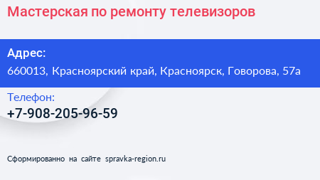 Мастерская по ремонту телевизоров по адресу 660013, Красноярский край, Красноярск, Говорова, 57а в дальнейшем Организация, размещена в следующих категориях: