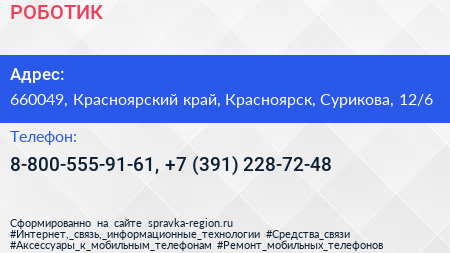 РОБОТИК по адресу 660049, Красноярский край, Красноярск, Сурикова, 12/6 в дальнейшем Организация, размещена в следующих категориях: