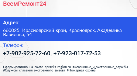ВсемРемонт24 по адресу 660025, Красноярский край, Красноярск, Академика Вавилова, 54 в дальнейшем Организация, размещена в следующих категориях: