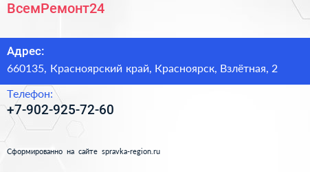 ВсемРемонт24 по адресу 660135, Красноярский край, Красноярск, Взлётная, 2 в дальнейшем Организация, размещена в следующих категориях: