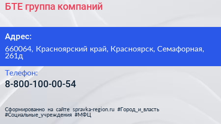 БТЕ, группа компаний по адресу 660064, Красноярский край, Красноярск, Семафорная, 261д в дальнейшем Организация, размещена в следующих категориях: