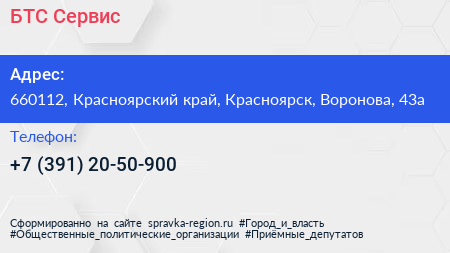 БТС-Сервис по адресу 660112, Красноярский край, Красноярск, Воронова, 43а в дальнейшем Организация, размещена в следующих категориях: