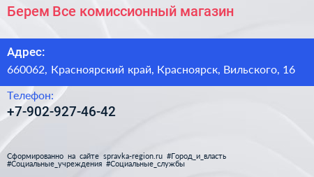 Берем Все, комиссионный магазин по адресу 660062, Красноярский край, Красноярск, Вильского, 16 в дальнейшем Организация, размещена в следующих категориях: