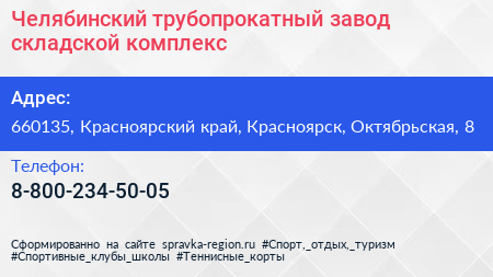 Челябинский трубопрокатный завод, складской комплекс по адресу 660135, Красноярский край, Красноярск, Октябрьская, 8 в дальнейшем Организация, размещена в следующих категориях: