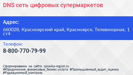 DNS, сеть цифровых супермаркетов по адресу 660028, Красноярский край, Красноярск, Телевизорная, 1 ст4 в дальнейшем Организация, размещена в следующих категориях: