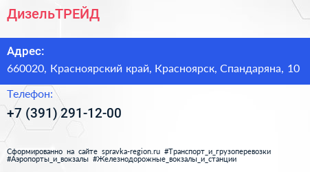 ДизельТРЕЙД по адресу 660020, Красноярский край, Красноярск, Спандаряна, 10 в дальнейшем Организация, размещена в следующих категориях: