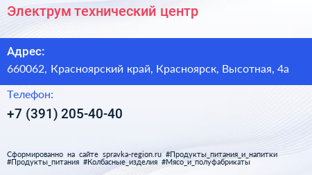 Электрум, технический центр по адресу 660062, Красноярский край, Красноярск, Высотная, 4а в дальнейшем Организация, размещена в следующих категориях: