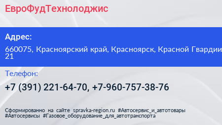 ЕвроФудТехнолоджис по адресу 660075, Красноярский край, Красноярск, Красной Гвардии, 21 в дальнейшем Организация, размещена в следующих категориях: