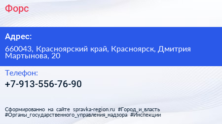 Форс по адресу 660043, Красноярский край, Красноярск, Дмитрия Мартынова, 20 в дальнейшем Организация, размещена в следующих категориях: