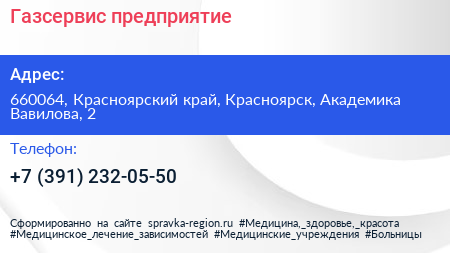 Газсервис, предприятие по адресу 660064, Красноярский край, Красноярск, Академика Вавилова, 2 в дальнейшем Организация, размещена в следующих категориях: