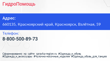 ГидроПомощь по адресу 660135, Красноярский край, Красноярск, Взлётная, 59 в дальнейшем Организация, размещена в следующих категориях: