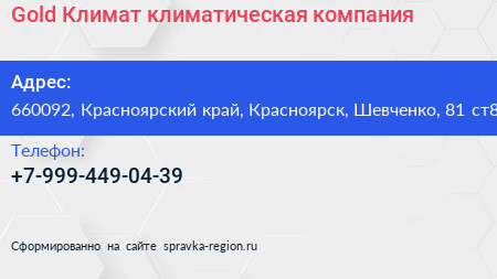 Gold Климат, климатическая компания по адресу 660092, Красноярский край, Красноярск, Шевченко, 81 ст8 в дальнейшем Организация, размещена в следующих категориях: