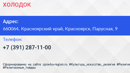 ХОЛОДОК по адресу 660064, Красноярский край, Красноярск, Парусная, 9 в дальнейшем Организация, размещена в следующих категориях: