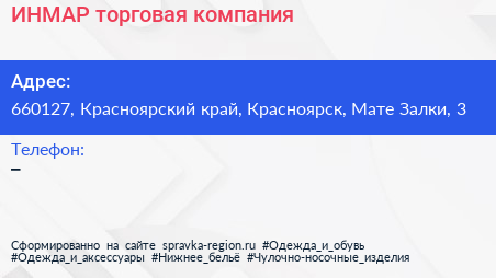 ИНМАР, торговая компания по адресу 660127, Красноярский край, Красноярск, Мате Залки, 3 в дальнейшем Организация, размещена в следующих категориях: