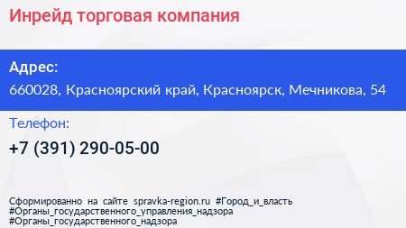 Инрейд, торговая компания по адресу 660028, Красноярский край, Красноярск, Мечникова, 54 в дальнейшем Организация, размещена в следующих категориях: