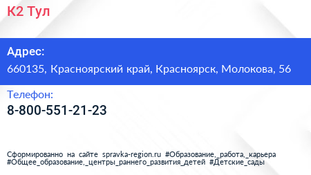 К2 Тул по адресу 660135, Красноярский край, Красноярск, Молокова, 56 в дальнейшем Организация, размещена в следующих категориях: