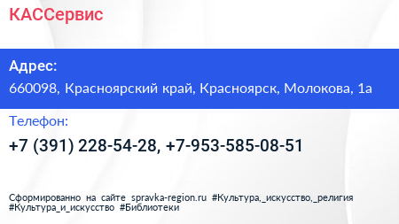 КАССервис по адресу 660098, Красноярский край, Красноярск, Молокова, 1а в дальнейшем Организация, размещена в следующих категориях: