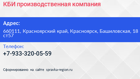 КБИ, производственная компания по адресу 660111, Красноярский край, Красноярск, Башиловская, 18 ст57 в дальнейшем Организация, размещена в следующих категориях:
