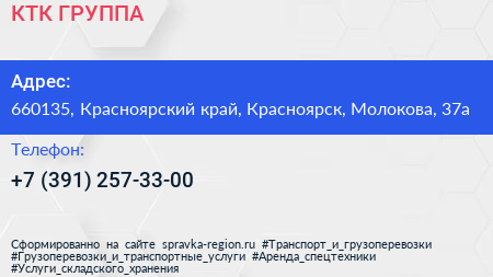 КТК ГРУППА по адресу 660135, Красноярский край, Красноярск, Молокова, 37а в дальнейшем Организация, размещена в следующих категориях: