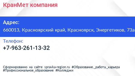 КранМет, компания по адресу 660013, Красноярский край, Красноярск, Энергетиков, 73а в дальнейшем Организация, размещена в следующих категориях: