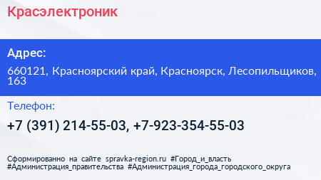 Красэлектроник по адресу 660121, Красноярский край, Красноярск, Лесопильщиков, 163 в дальнейшем Организация, размещена в следующих категориях: