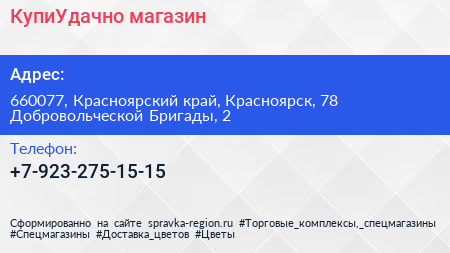 КупиУдачно, магазин по адресу 660077, Красноярский край, Красноярск, 78 Добровольческой Бригады, 2 в дальнейшем Организация, размещена в следующих категориях: