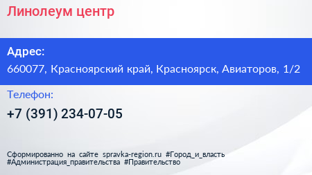 Линолеум центр по адресу 660077, Красноярский край, Красноярск, Авиаторов, 1/2 в дальнейшем Организация, размещена в следующих категориях: