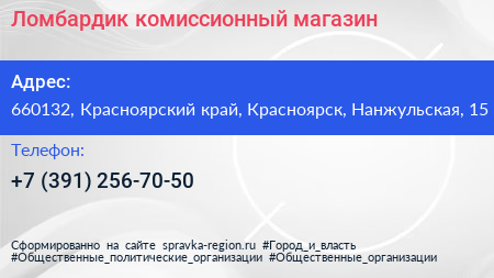 Ломбардик, комиссионный магазин по адресу 660132, Красноярский край, Красноярск, Нанжульская, 15 в дальнейшем Организация, размещена в следующих категориях: