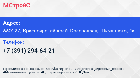 МСтройС по адресу 660127, Красноярский край, Красноярск, Шумяцкого, 4а в дальнейшем Организация, размещена в следующих категориях:
