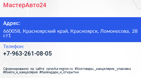 МастерАвто24 по адресу 660058, Красноярский край, Красноярск, Ломоносова, 28 ст1 в дальнейшем Организация, размещена в следующих категориях: