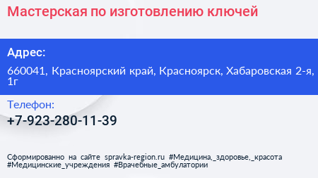 Мастерская по изготовлению ключей по адресу 660041, Красноярский край, Красноярск, Хабаровская 2-я, 1г в дальнейшем Организация, размещена в следующих категориях: