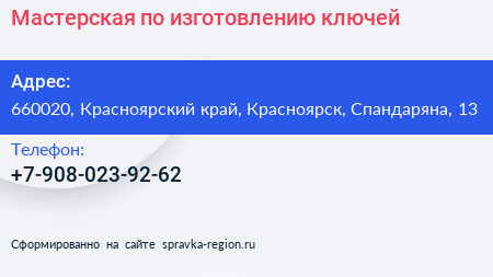 Мастерская по изготовлению ключей по адресу 660020, Красноярский край, Красноярск, Спандаряна, 13 в дальнейшем Организация, размещена в следующих категориях:
