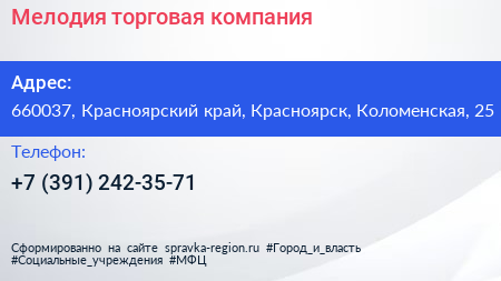 Мелодия, торговая компания по адресу 660037, Красноярский край, Красноярск, Коломенская, 25 в дальнейшем Организация, размещена в следующих категориях: