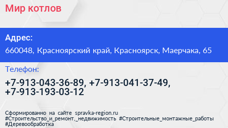 Мир котлов по адресу 660048, Красноярский край, Красноярск, Маерчака, 65 в дальнейшем Организация, размещена в следующих категориях: