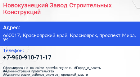 Новокузнецкий Завод Строительных Конструкций по адресу 660017, Красноярский край, Красноярск, проспект Мира, 94 в дальнейшем Организация, размещена в следующих категориях:
