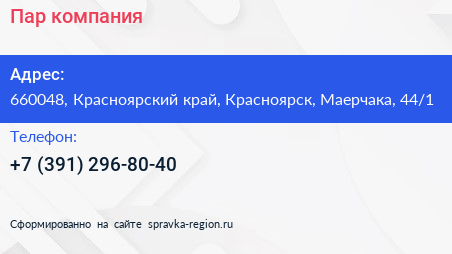 Пар, компания по адресу 660048, Красноярский край, Красноярск, Маерчака, 44/1 в дальнейшем Организация, размещена в следующих категориях: