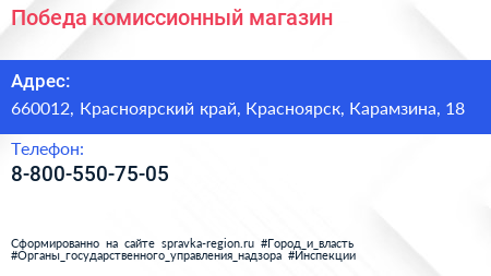 Победа, комиссионный магазин по адресу 660012, Красноярский край, Красноярск, Карамзина, 18 в дальнейшем Организация, размещена в следующих категориях: