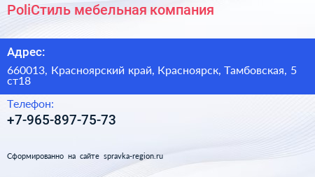 PoliСтиль, мебельная компания по адресу 660013, Красноярский край, Красноярск, Тамбовская, 5 ст18 в дальнейшем Организация, размещена в следующих категориях: