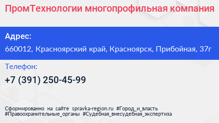 ПромТехнологии, многопрофильная компания по адресу 660012, Красноярский край, Красноярск, Прибойная, 37г в дальнейшем Организация, размещена в следующих категориях: